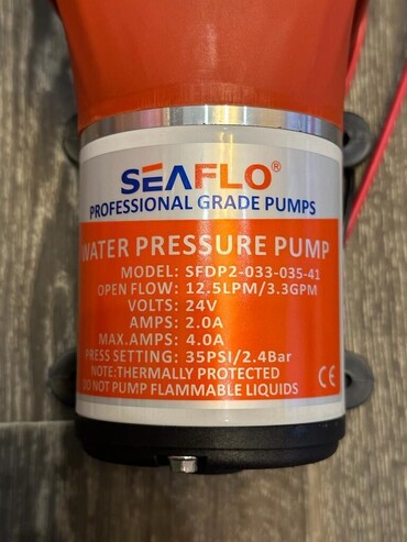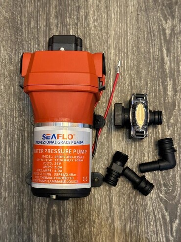 Насос серии 41 обеспечивает большой объем расхода воды с меньшим числом циклов работы благодаря четырехкамерной диафрагме и внутреннему байпасу. Эти модели предназначены для работы в водяных системах без накопительного бака, и с пятью выходами. Он также подходит для использования с водяной системой бака-сборника. Он обеспечивает до 12,5 литров в минуту. Насосы серии 41 являются самовсасывающими и могут работать всухую без повреждений. Этот автоматический насос системы подачи воды имеет встроенное реле давления, которое автоматически запускает и останавливает насос при открытии и закрытии крана. Их легко устанавливать, обслуживать и готовить к зиме благодаря быстросъемным фитингам. Напряжение: 24 В/220 В Потребляемый ток: 4.0 A Производительность: 11,3 л/мин Рабочее давление: 3,8 бар Высота всасывания 6 футов (1,8 м) Максимальная рекомендуемая температура: 60 ° C Материал: EPDM (клапаны) / сантопрен (диафрагма) Порты: Быстроразъемные фитинги • Резиновые монтажные ножки • Для пресной и соленой воды
